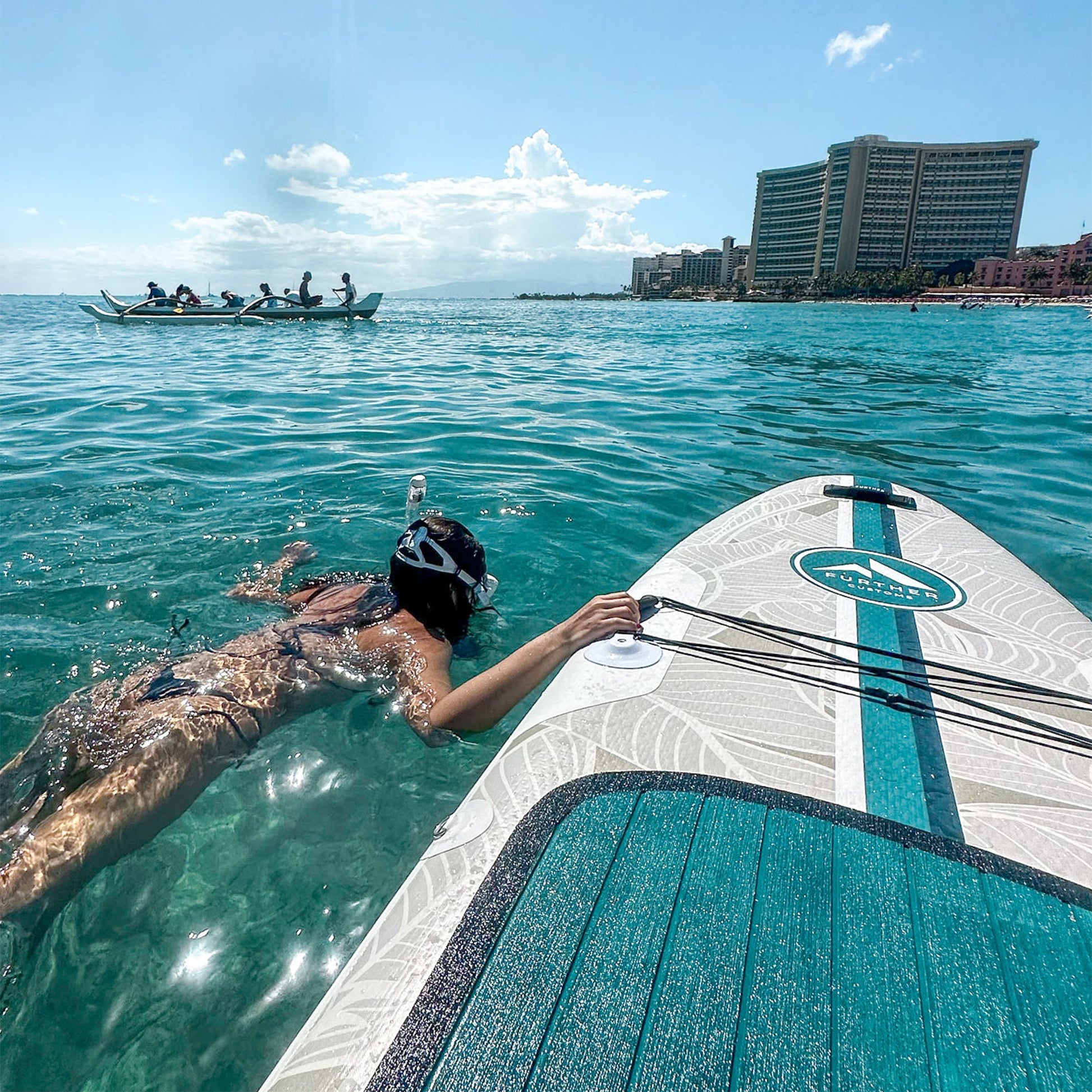 The Avalon Emerald Inflatable Paddle Board is 11’0” long, 32” wide and 6" thick. The premium Woven drop-stitch construction provides a lightweight and responsive feel when paddling. Our innovative 3X Carbon layering process integrates two reinforcing layers of PVC and an extra layer of carbon fiber along the sidewall. This technique significantly increases the boards rigidity for improved speed and stability. Additionally, all of our boards are made using a Welded construction to ensure a lasting & resilient bond against all elements. With a weight capacity of 320 lbs, riders can enjoy this board solo or share their adventure with a loved one.