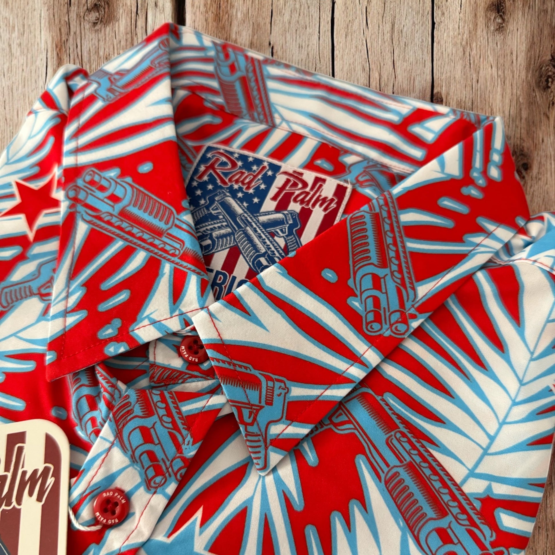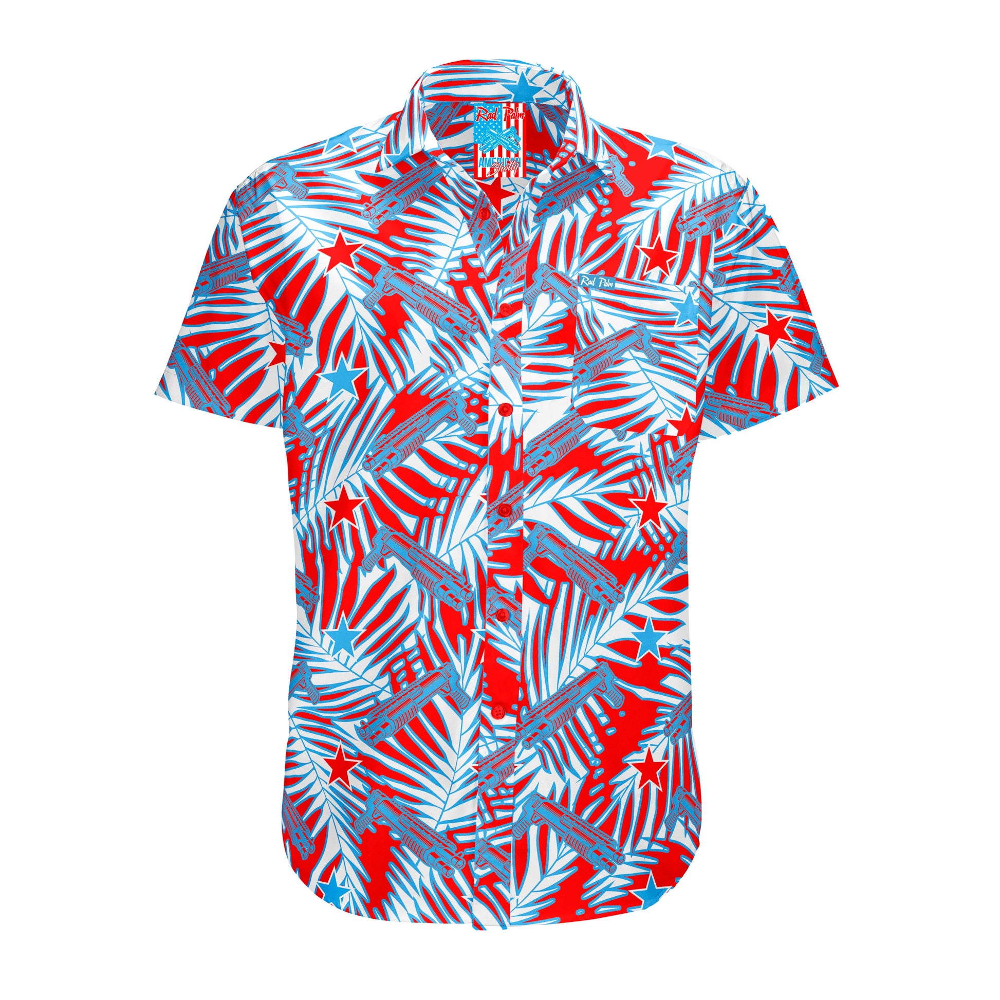 The American Shotty isn’t subtle—and that’s the point. This red, white, and blue banger is covered in tropical palms, bold stars, and a full arsenal of pump-action freedom. Made for backyard barbecues, boat days, and lighting up the sky with questionable decisions, it’s lightweight, breathable, and sharp enough to turn heads wherever you go.