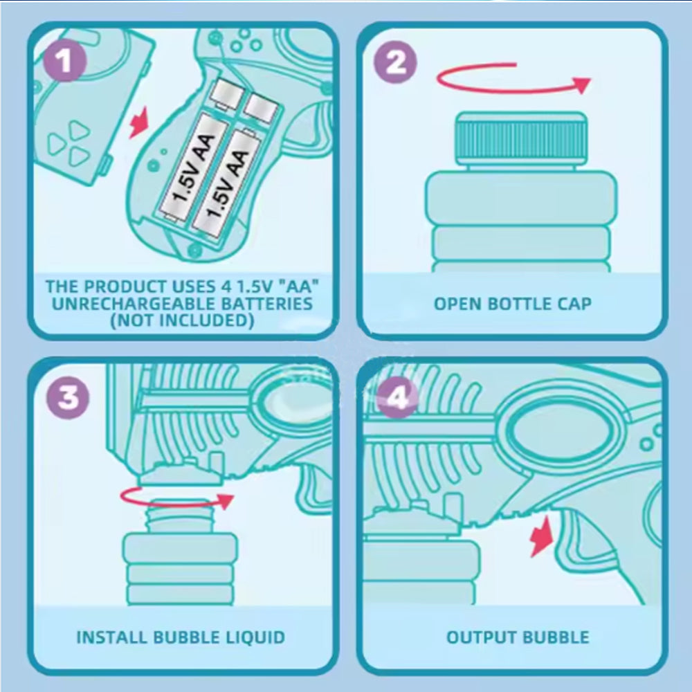 - Bubble gun comes with 72 bubble holes and a powerful motor that can produce hundreds of bubbles per minute. Requires 4 AA batteries, not included.