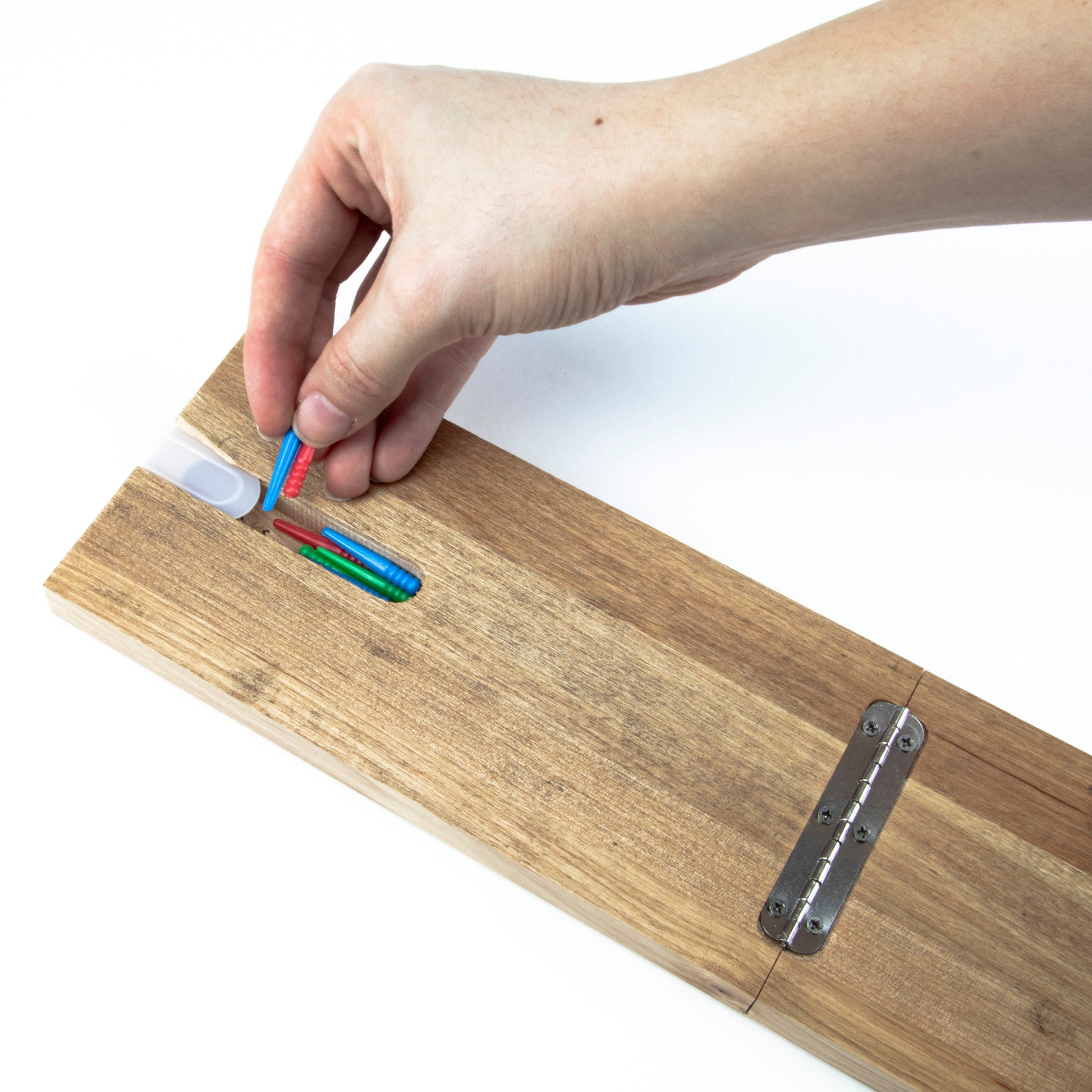 This ingenious little Cribbage stores its cards and pegs inside the folding wooden game board. Portable, demure, mindful.