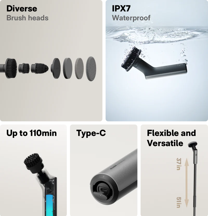 - Extended Reach and Versatility: Features an extendable handle and 6 interchangeable brush heads for versatile applications.