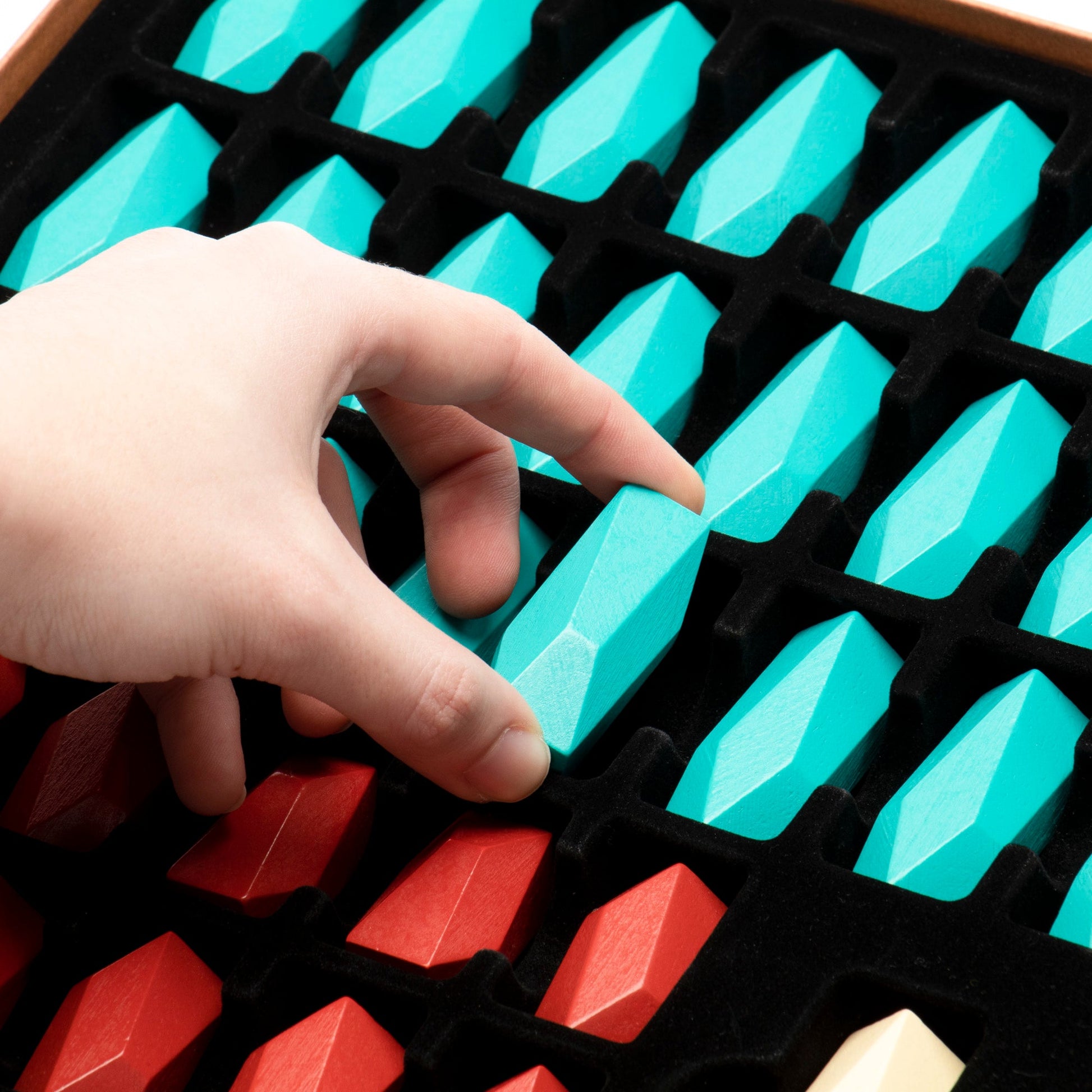- Flocked box insert that snugly holds all 37 pieces: a 2.5" oversize King piece, twelve 1.5" defender pieces, and twenty-four 2" attacker pieces