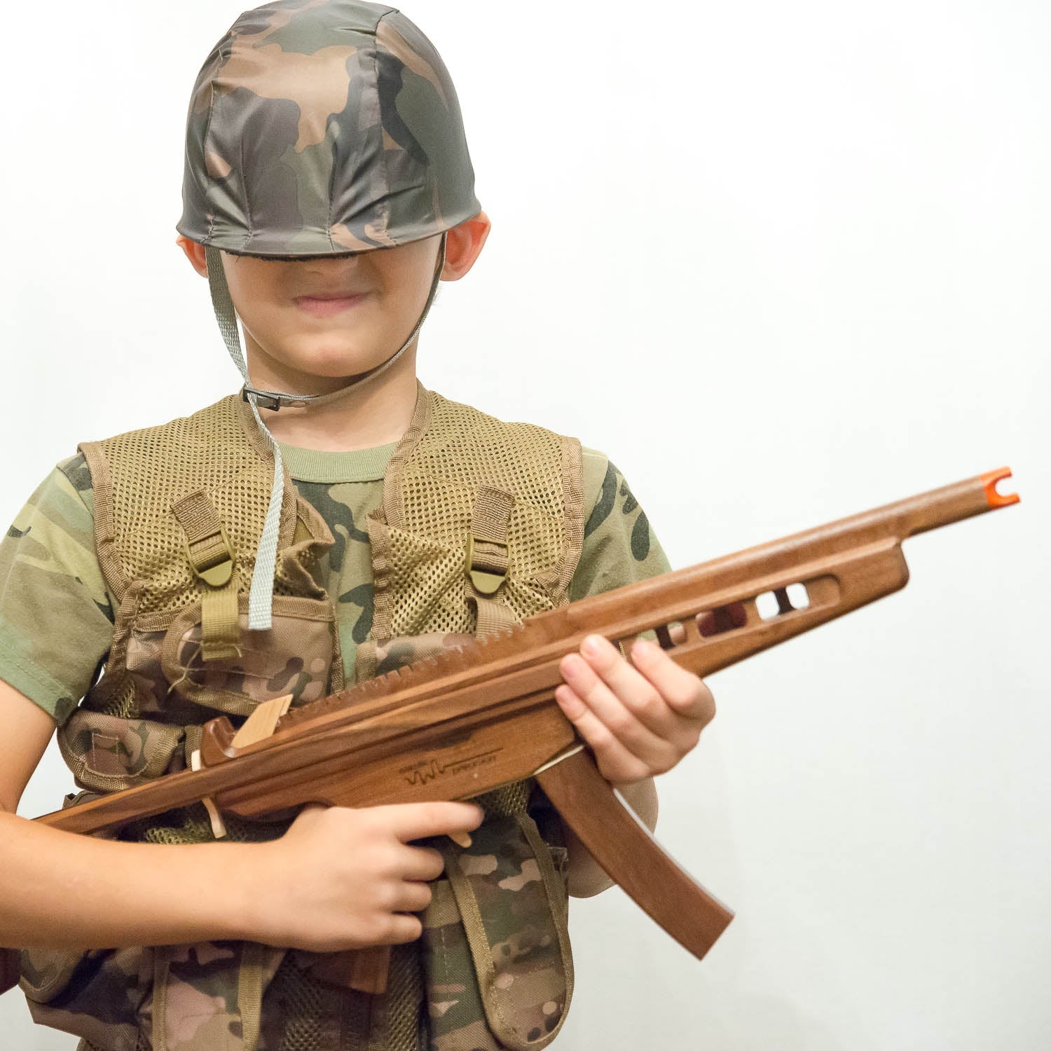 Enter Bandman - Introducing our MP5, inspired by H&K MP5 - the most widely used submachine gun of military and police forces around the world. This awesome piece of craftsmanship, cut from solid hardwoods like Maple and Walnut, unleashes the power of 24 bands up to 30 feet giving you the ultimate leg up in your office warfare. Comes with 100 bands. Roger That