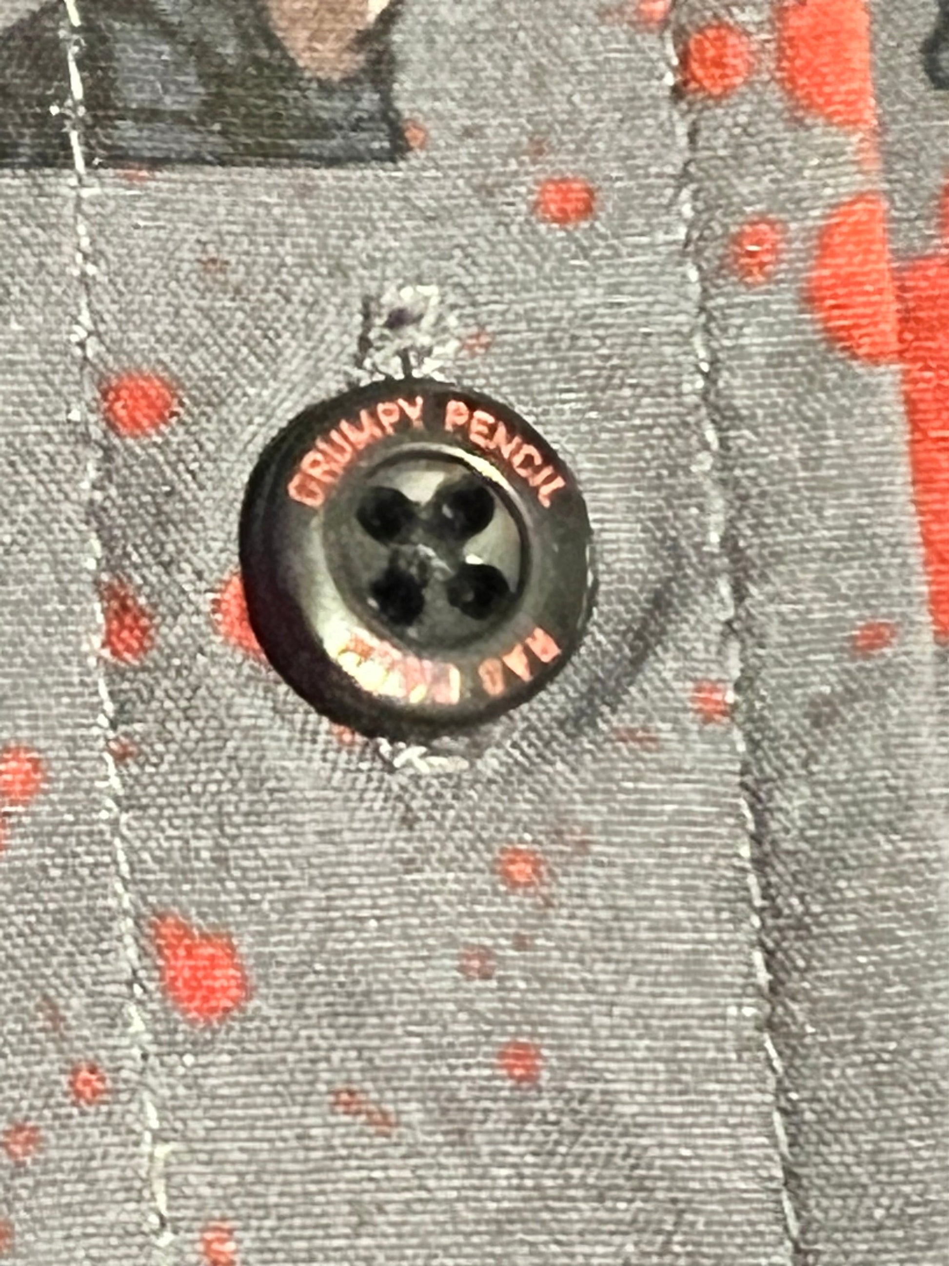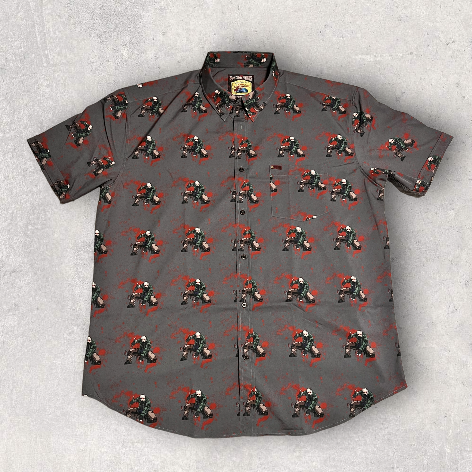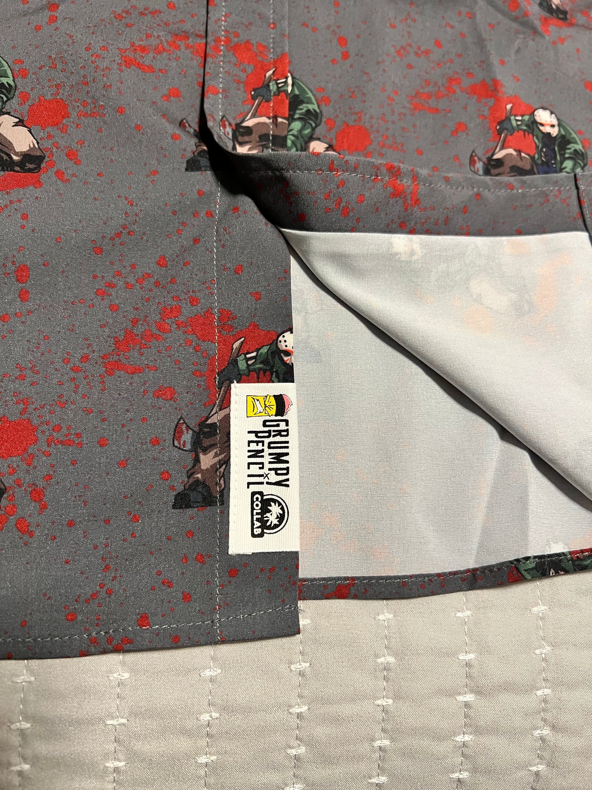 Our first COLLAB shirt with Grumpy Pencil! The Jason Kills shirt features art by Joshua Johnson. This contended shirt features hidden collar buttons, engraved buttons, sticker hang tag, and custom labeling. Made of the same 93% poly 7% spandex blend you live and keeps you cool and comfortable on hot days.