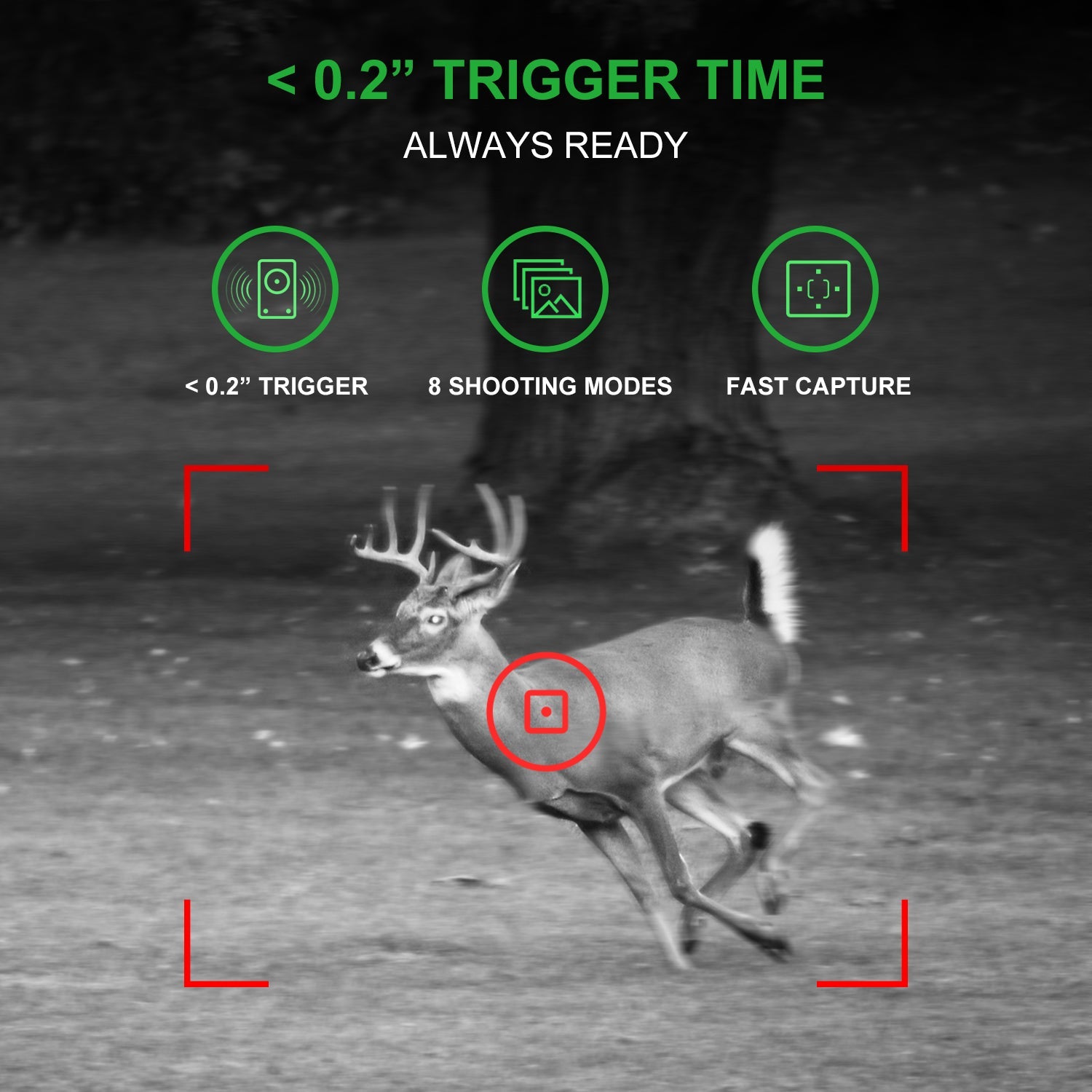 - TRIGGER TIME – Capture images quicker than 0.2 seconds after sensing motion within the 120° angle of detection of the front and side PIR sensors. 40 Infrared Night Vision LED flash illuminates subjects as far as 65 feet (20 meters) to produce a clear image in both day and night.