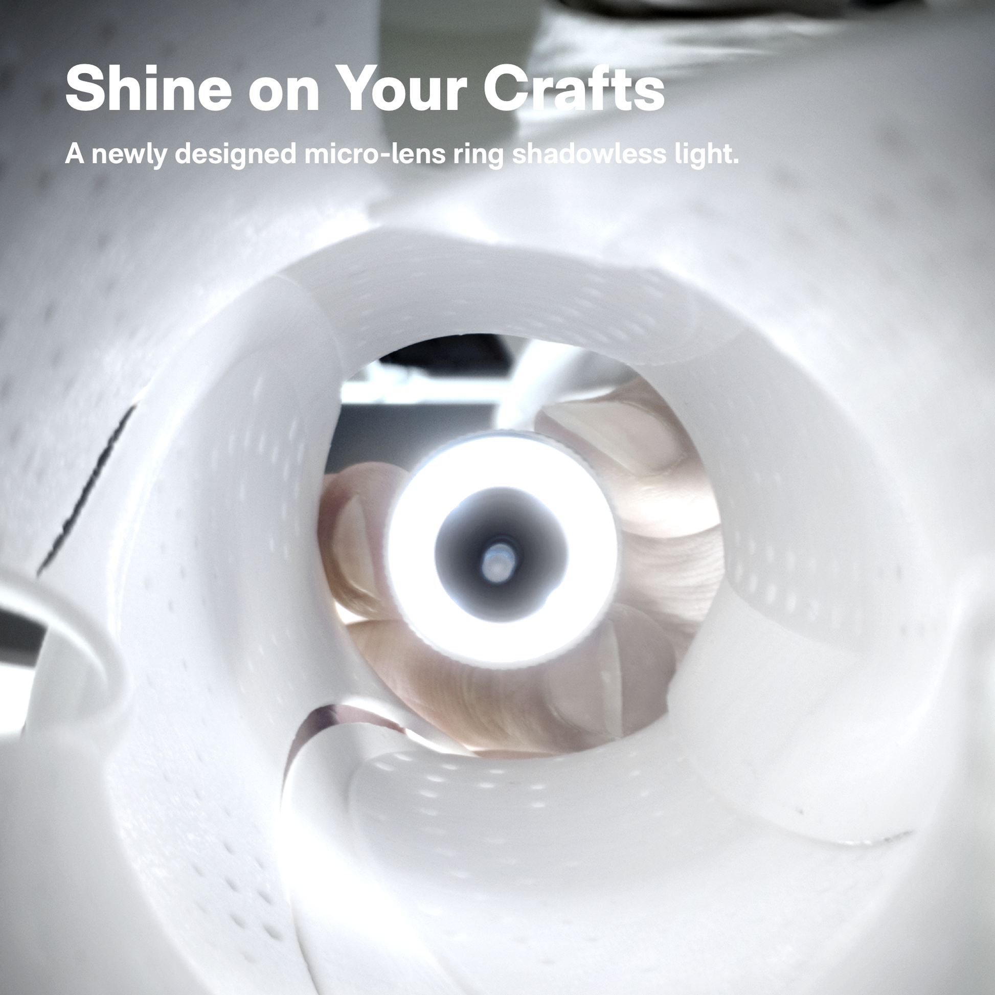 - Illuminated Workspace: The ring LED light illuminates the work area for shadowless operation.